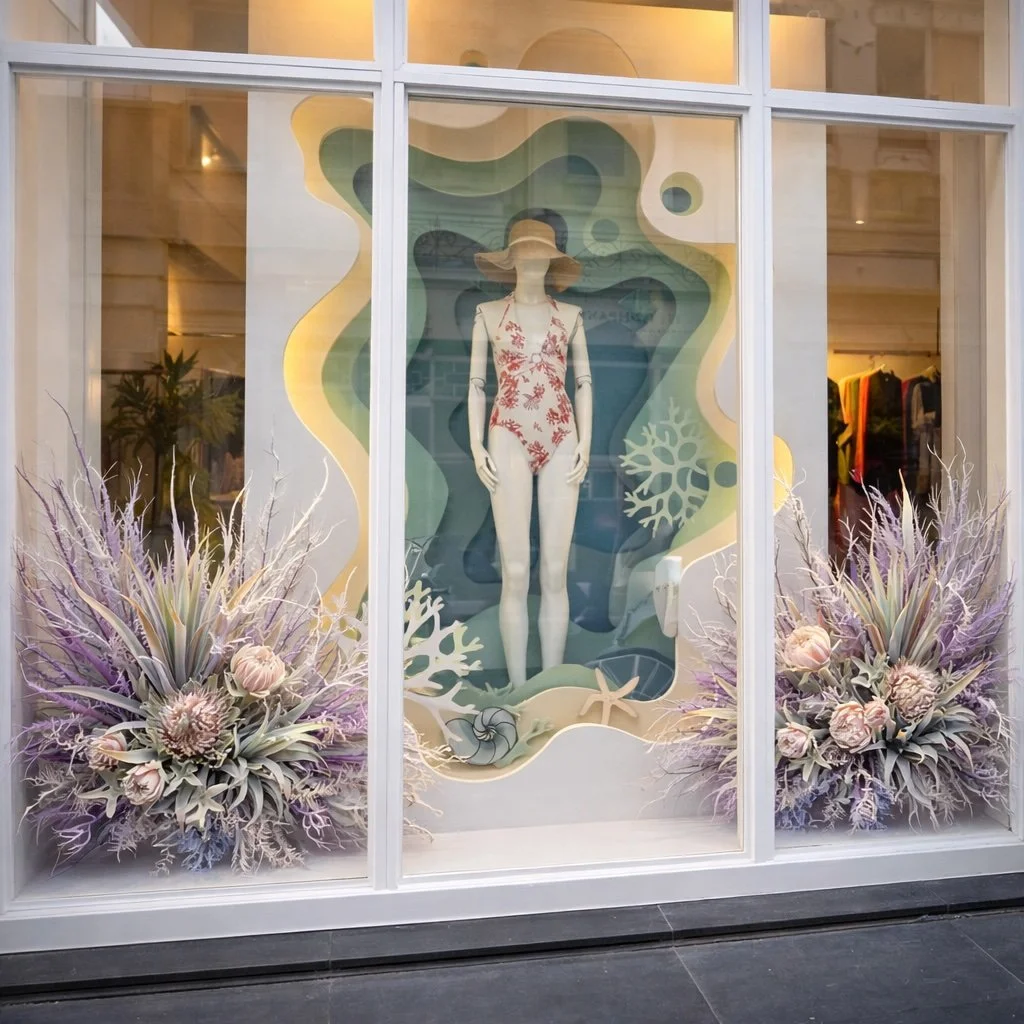 Fully integrated window displays creating a complete, immersive façade. Smaller arrangements placed around the store quoted at an additional price.